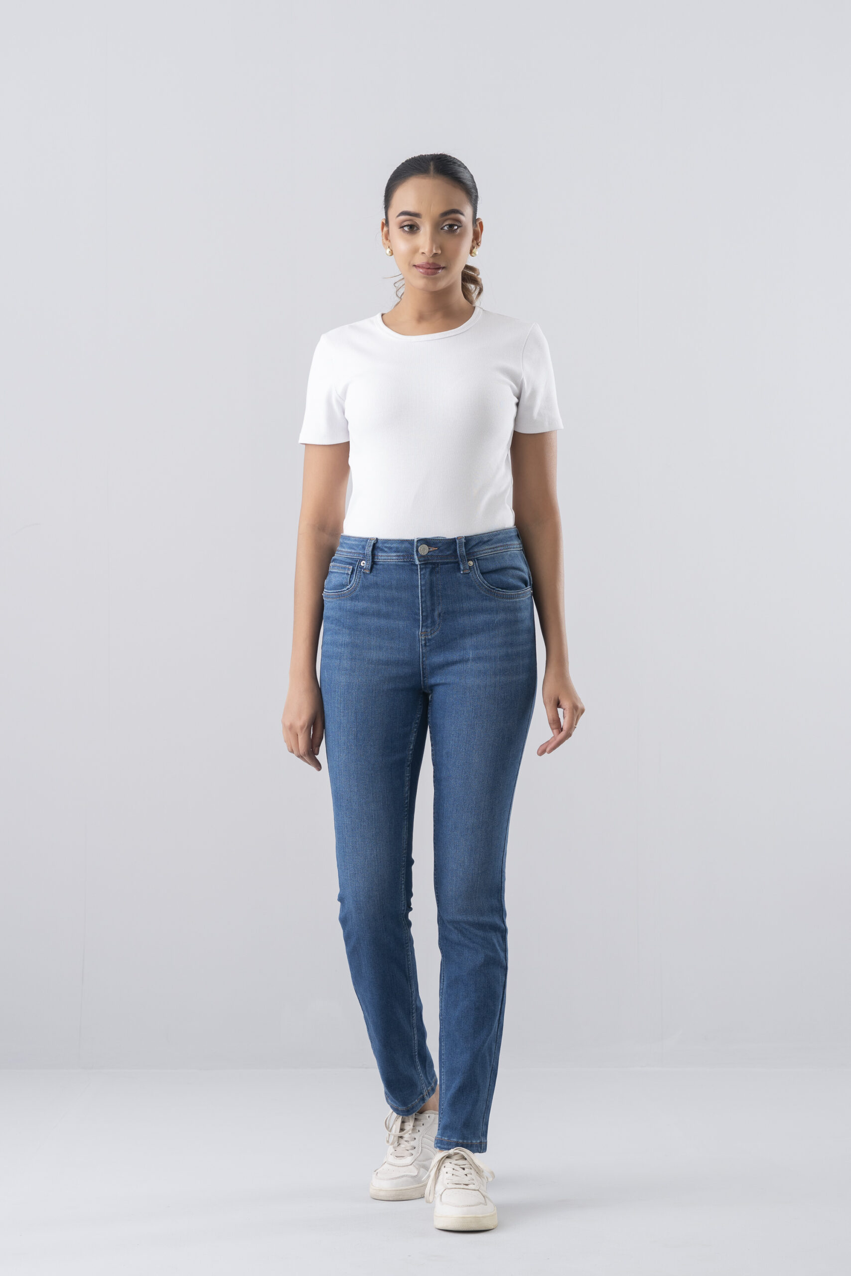 These Women’s Mid-Blue Skinny Jeans offer a classic, body-sculpting silhouette designed for a streamlined look from waist to ankle. Crafted from high-stretch denim with a versatile mid-indigo wash, they feature subtle fading and a high-rise waist for all-day comfort and support.