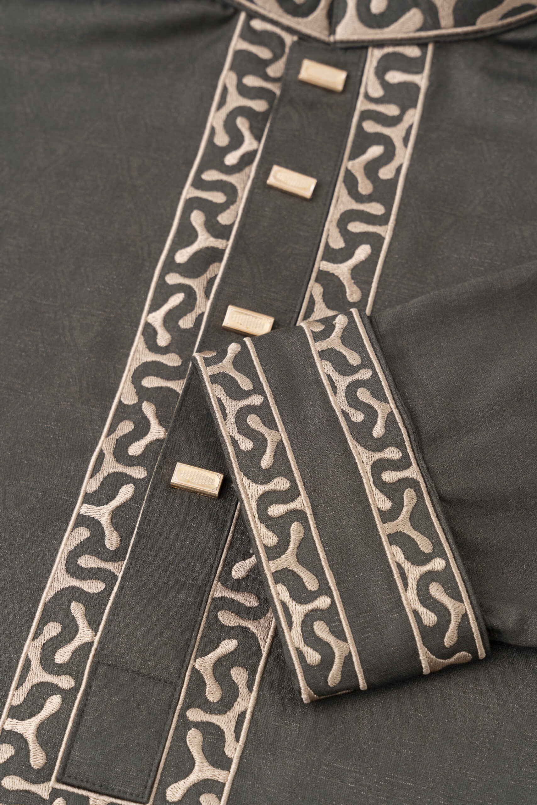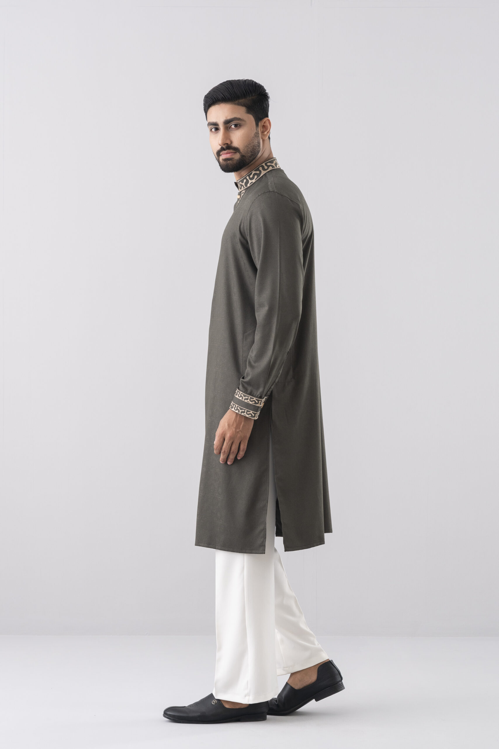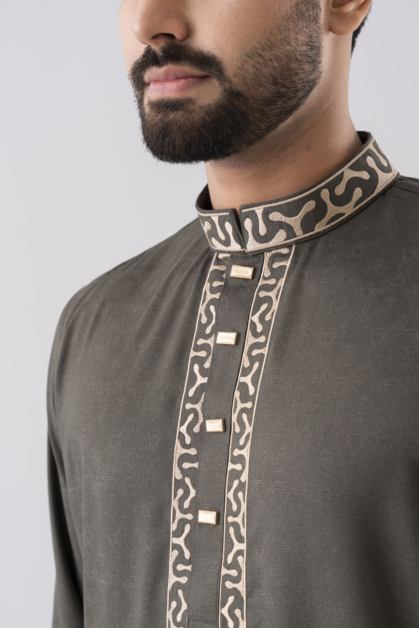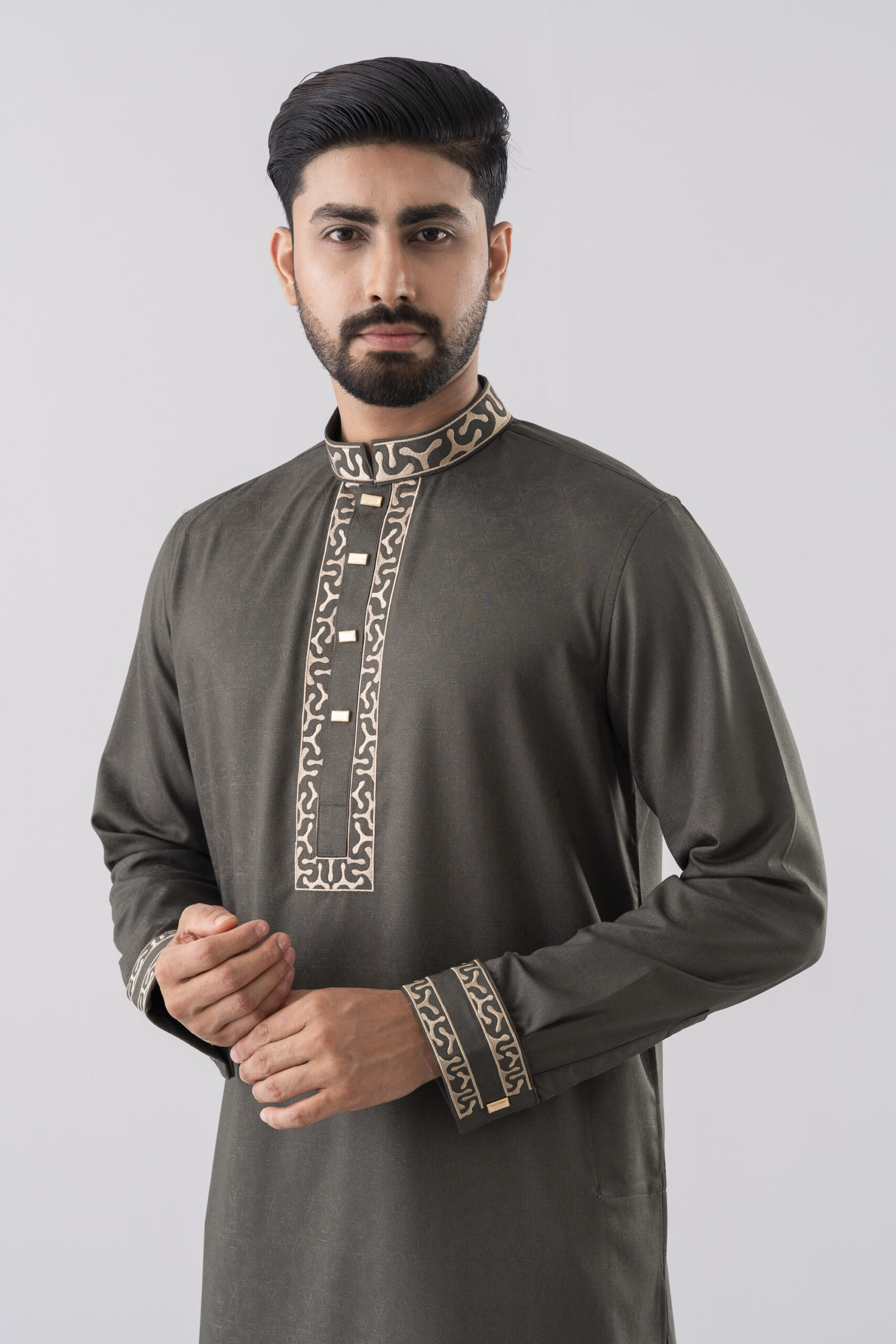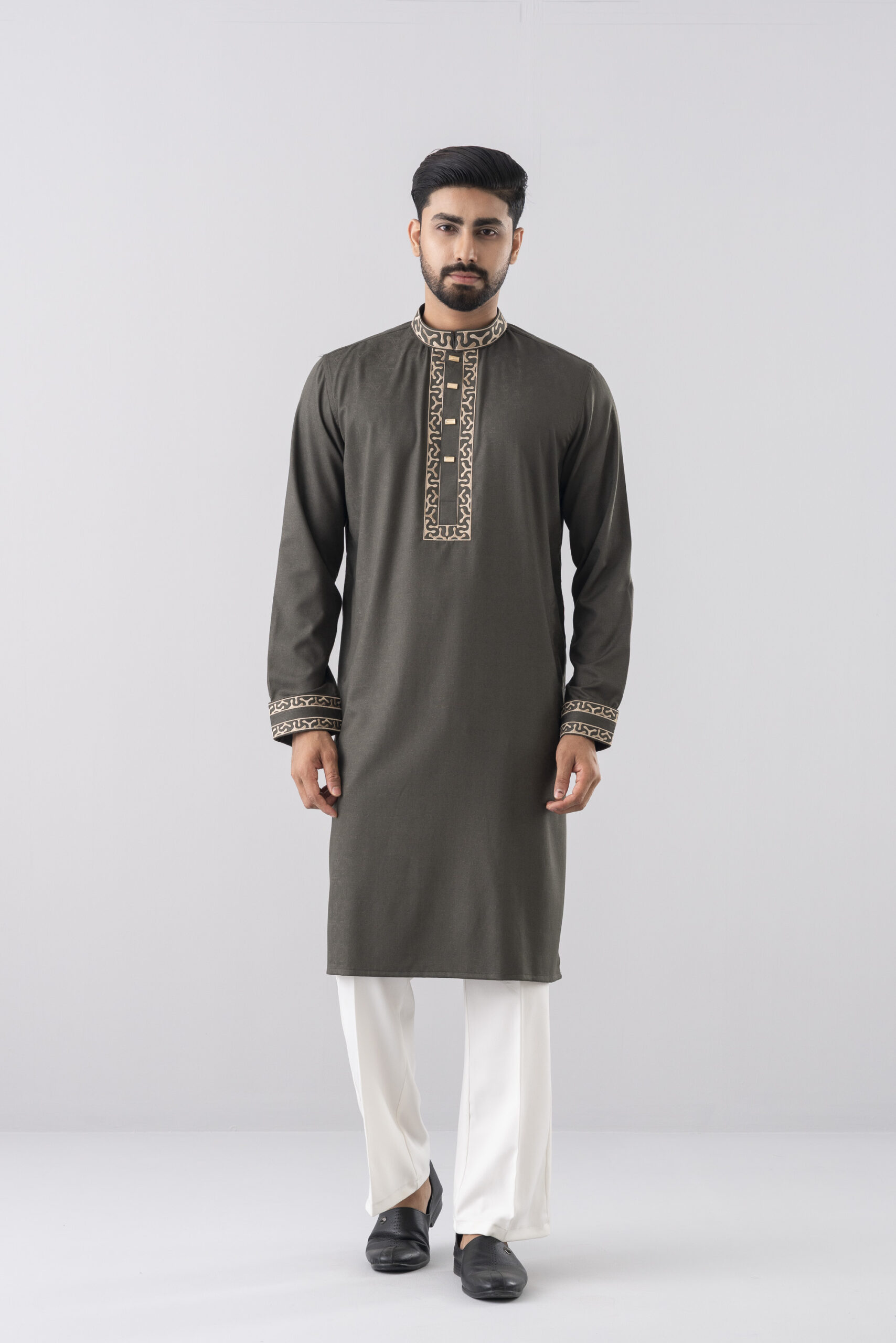 The Desert Olive Panjabi blends classic tradition with refined modern tailoring. Crafted in a rich olive green fabric, it features intricate beige embroidery on the mandarin collar, placket, and cuffs, creating a bold yet elegant visual detail.