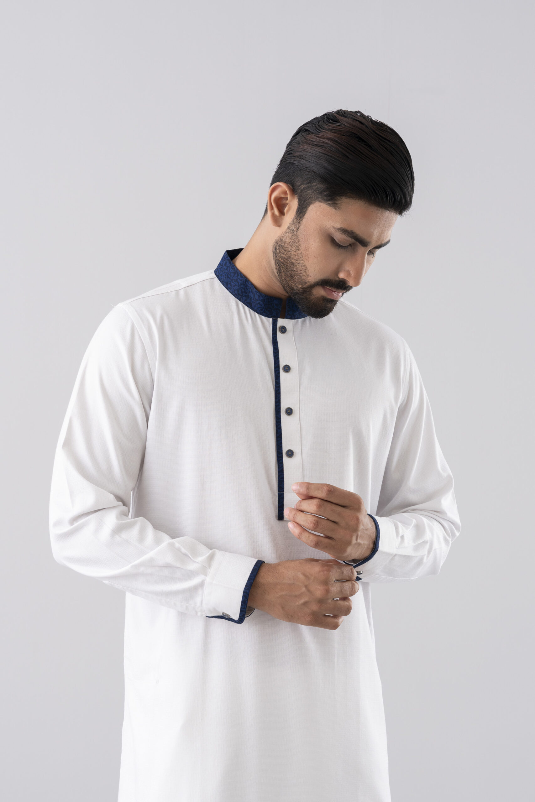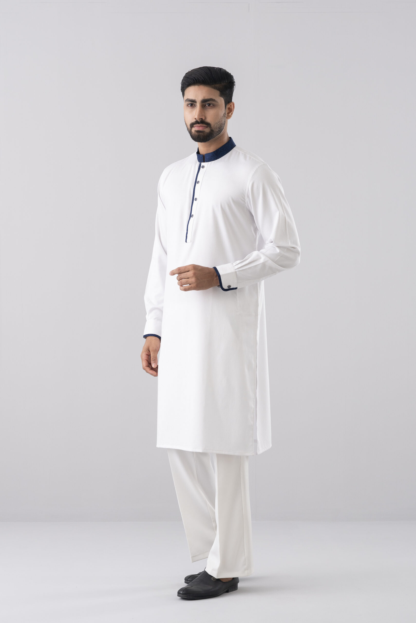 A minimal Ivory Edge Panjabi featuring a refined navy contrast collar and placket, designed with a modern tailored fit for elegant traditional wear.