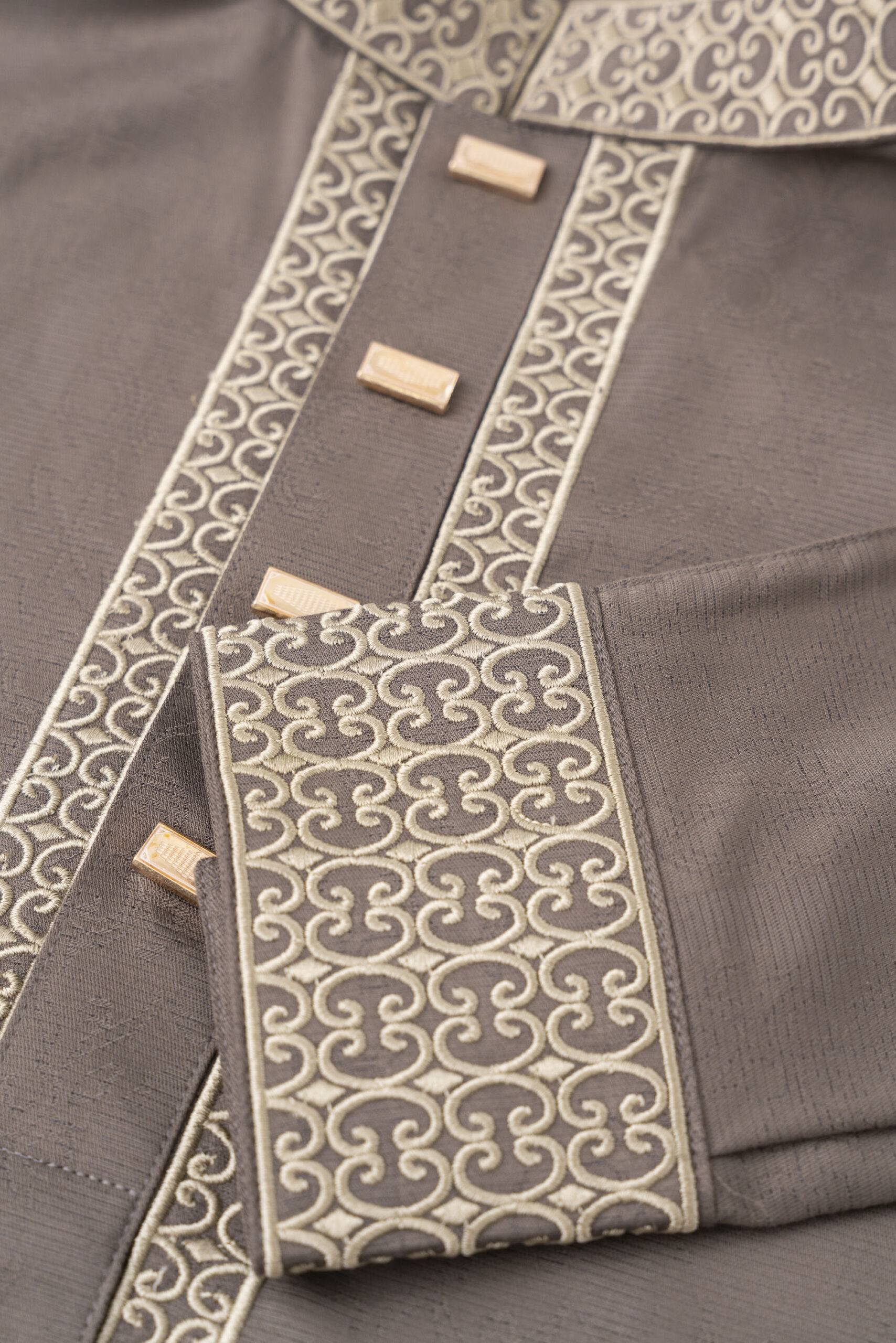 | Description | A sophisticated mocha brown Panjabi featuring antique gold embroidery and a modern tailored fit for elegant festive wear. | A bold and refined statement piece crafted in deep charcoal with a contrasting sand-toned collar and intricate embroidered placket. Finished with premium metallic buttons, this Panjabi delivers festive elegance with modern structure — perfect for evening occasions and celebrations. | A folded dark green traditional garment with silver embroidered stripes and geometric trim along the collar and front. | A refined Silver Thread Panjabi with subtle tonal embroidery and a modern tailored fit, perfect for elegant festive and traditional wear. | A refined Mint Heritage Panjabi featuring subtle vertical texture and delicate embroidery on the collar and placket. Designed with a modern tailored fit for elegant festive and formal occasions. | Lightweight and breathable, this premium cream Panjabi features a bold navy contrast collar with refined embroidered placket detailing. Designed for summer comfort with a modern tailored finish — perfect for festive and formal occasions. | ||||||||||||